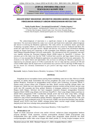 Nabila, Kamila Hasna and Kurniabudi, Kurniabudi and Chindra, Saputra (2022) Analisis minat mahasiswa Universitas Dinamika Bangsa Jambi dalam penggunaan Mendeley dengan menggunakan metode TAM. Jurnal Informatika dan Tekonologi Komputer, 2 (1): 9. pp. 90-100. ISSN 2809-9249