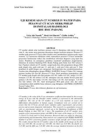 CT number adalah nilai koefisien atenuasi sinar-X ditentukan oleh energi rata-rata sinar-X dan nomor atom penyerap dinyatakan dengan koefisien atenuasi. Peranan CT number pada pesawat CT Scan untuk menilai serta membedakan kelainan pada organ manusia. Uji kesesuaian dilakukan untuk memastikan pesawat CT-Scan memenuhi pesyaratan keselamatan radiasi dan memberikan informasi diagnosis yang tepat dan akurat. Penelitian ini merupakan penelitian kuantitatif pendekatan eksperimental, dilakukan di instalasi Radiologi RSU Bunda Padang pada bulan Juni 2022 selama 5 hari. Populasi seluruh uji CT number, sampel pada lima titik pengukuran dengan ROI pada tengah citra, pada arah jam 12, arah jam 3, arah jam 6 dan arah jam 9. Data penelitian di ambil dengan cara mengamati, bereksperimen dan mendokumentasikan. Analisis data dibandingkan dengan PERKA BAPETEN Nomor 9 Tahun 2011 tentang jaminan kualitas QA dan QC pesawat CT Scan. Hasil penelitian menunjukkan nilai CT number pada tengah citra hari pertama 4,83 HU, kedua 4,83 HU, ketiga 4,14 HU, keempat 5,15 HU dan kelima 5,16 HU sedangkan rata-rata standar deviasi pada hari pertama 3,48 HU, hari kedua 3,42 HU, hari ketiga 3,41 HU, hari keempat 3,43 HU dan hari kelima 3,50 HU, hasil keseragaman ROI pada pusat citra dan noise