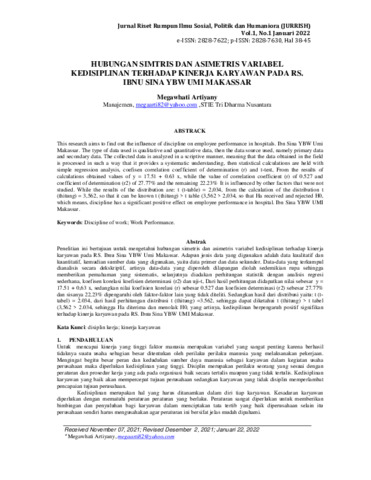 Megawhati, Artiyany (2022) Hubungan simetris dan asimetris variabel kedisiplinan terhadap kinerja karyawan pada RS. Ibnu Sina YBW Umi Makassar. Jurnal Riset Rumpun Ilmu Sosial, Politik dan Humaniora, 1 (1): 5. pp. 38-45. ISSN 2828-7630