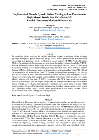 Udriansyah, Udriansyah and Zaifatur, Ridha (2023) Implementasi metode syawir dalam meningkatkan pemahaman fiqih materi dzikir dan do’a kelas VII Pondok Pesantren Modern Babussalam. Student Scientific Creativity Journal, 1 (1): 8. pp. 123-131. ISSN 2985-3761