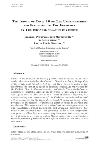 Emanuel, Pranawa Dhatu Martasudjita and Yohanes, Subali and Paulus, Paulus (2023) The impact of Covid-19 on the understanding and perceiving of the Eucharist in the Indonesian Catholic church. Jornal of Asian Orientation in Theology, 5 (2): 2. pp. 223-242. ISSN 2775-3425