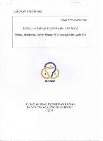 Firsoni, Firsoni and Suharyono, Suharyono and Sugoro, Irawan and Sasongko, Wahidin Teguh and Murni, Adria Prilia (2016) Formula Pakan Ruminansia dan Ikan. Technical Report. PAIR - BATAN.