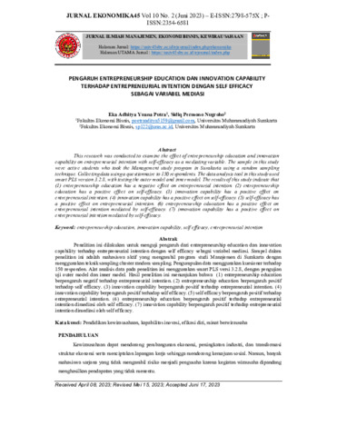 Eka, Adhitya Yuana Putra and Sidiq, Permono Nugroho (2023) Pengaruh entrepreneurship education dan innovation capability terhadap entrepreneurial intention dengan Self Efficacy sebagai variabel mediasi. Ekonomika45, 10 (2). pp. 239-250. ISSN 2354-6581