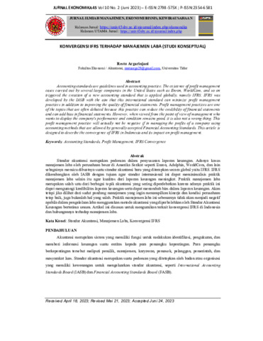 Restu, Argarinjani (2023) Konvergensi IFRS terhadap manajemen laba (studi konseptual). Ekonomika45, 10 (2). pp. 251-262. ISSN 2354-6581