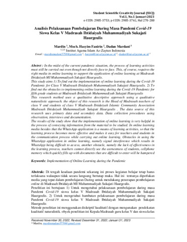 Mardin, Mardin and Moch., Hasyim Fanirin and Dadan, Mardani (2023) Analisis pelaksanaan pembelajaran daring masa pandemi COVID-19 siswa kelas V Madrasah Ibtidaiyah Muhammadiyah Sukajati Haurgeulis. Student Scientific Creativity Journal, 1 (1): 20. pp. 270-280. ISSN 2985-3761
