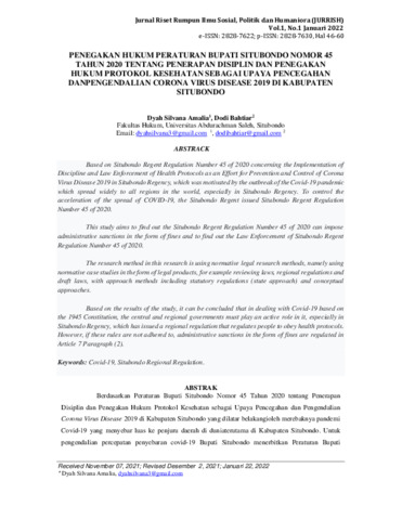 Dyah, Silvana Amalia and Dodi, Bahtiar (2022) Penegakan hukum Peraturan Bupati Situbondo Nomor 45 Tahun 2020 tentang penerapan disiplin dan penegakan hukum protokol kesehatan sebagai upaya pencegahan dan pengendalian corona virus disease 2019 di Kabupaten Situbondo. Jurnal Riset Rumpun Ilmu Sosial, Politik dan Humaniora, 1 (1): 6. pp. 46-60. ISSN 2828-7630