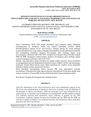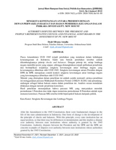 Dyah, Silvana Amalia (2022) Sengketa kewenangan antara presiden dengan Dewan Perwakilan Rakyat Dan Badan Pemeriksa Keuangan dalam perkara divestasi PT. New Mount. Jurnal Riset Rumpun Ilmu Sosial, Politik dan Humaniora, 1 (1): 7. pp. 61-83. ISSN 2828-7630