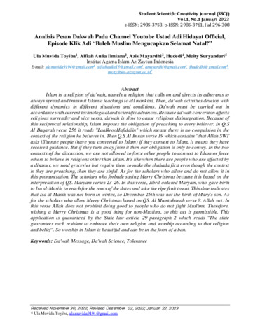 Ula, Muvida Toyiba and Alfiah, Aulia Ilmiana and Azis, Mayardhi and Hudedi, Hudedi and Meity, Suryandari (2023) Analisis pesan dakwah pada channel Youtube ustad Adi Hidayat official, episode klik Adi “Boleh muslim mengucapkan selamat Natal?”. Student Scientific Creativity Journal, 1 (1): 23. pp. 296-308. ISSN 2985-3761