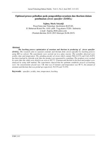 Sajima, Sajima and Setyadji, Mochamad (2015) Optimasi proses pelindian pada pengambilan uranium dan thorium dalam pembuatan zircon opacifier (ZrSiO4). Jurnal Teknologi Bahan Nuklir, 11 (2). ISSN ISSN: 1907-2635