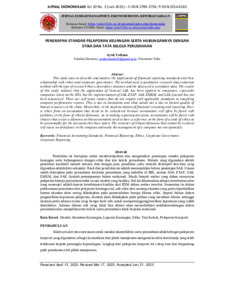 Penelitian ini bertujuan untuk mendeskripsikan dan menganalisis penerapan standar pelaporan keuangan serta hubungannya dengan etika dan tata kelola perusahaan. Metode yang digunakan adalah penelitian kualitatif metode reduksi data dengan jenis penelitian yaitu statistik deskriptif dan data yang digunakan adalah data sekunder. Hasil dari penelitian ini adalah menunjukkan bahwa penerapan SAK Umum sudah diterapkan pada perusahaan terutama perusahaan yang terdaftar di BEI, namun SAK ETAP, SAK EMKM, dan SAK Syariah penerapannya belum maksimal. Masih banyak entitas yang dalam menyusun pelaporan kinerja perusahaan tidak sesuai standar yang berlaku. Hal ini dikarenakan adanya keterbatasan dan yang menonjol adalah karena keterbatasan kualitas dari SDM dalam entitas tersebut. Sementara itu dalam pelaksanaan pencatatan dan pelaporan keuangan ini, ada etika dari seorang akuntan yang perlu diperhatikan karena akuntan akan sering dihadapkan pada permasalahan berupa dilema etika. Seperti halnya dalam pengambilan keputusan pelaporan, akuntan akan dihadapkan pada pilihan yang membuat dilema sehingga akuntan perlu adanya acuan yang berupa kode etik untuk mempertanggungjawabkan keputusan yang sudah diambilnya. Adanya dilema etik yang tidak bisa diatasi akan menyebabkan ketidakseimbangan dalam perusahaan dan menjadikan tata kelola suatu perusahaan tidak berjalan maksimal.