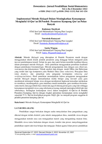 Raidatam, Mardiyah and Nurmisda, Ramayani and Satria, Wiguna (2022) Implementasi metode halaqah dalam meningkatkan kemampuan menghafal Alquran di Pondok Pesantren Kampung Quran Pulau Banyak. Dewantara: Jurnal Pendidikan Sosial Humaniora, 1 (4): 14. pp. 143-154. ISSN 2962-1135