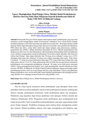 Atika, Alwinda and Satria, Wiguna (2022) Upaya meningkatkan hasil belajar siswa melalui model pembelajaran bamboo dancing pada mata pelajaran sejarah kebudayaan Islam di kelas VIII MTs Al-Hidayah Gebang. Dewantara: Jurnal Pendidikan Sosial Humaniora, 1 (4): 15. pp. 155-166. ISSN 2962-1135