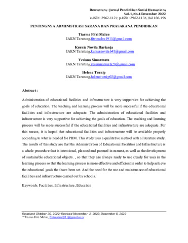 Tiarma, Fitri Malau and Kurnia, Novita Harianja and Yesiana, Simarmata and Helena, Turnip (2022) Pentingnya administrasi sarana dan prasarana pendidikan. Dewantara: Jurnal Pendidikan Sosial Humaniora, 1 (4): 18. pp. 186-195. ISSN 2962-1135