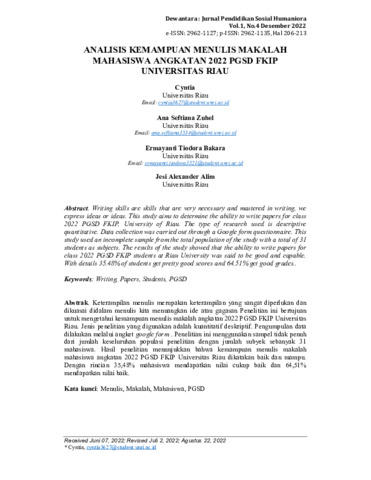 Cyntia, Cyntia and Ana, Seftiana Zuhel and Ermayanti, Tiodora Bakara (2022) Analisis kemampuan menulis makalah mahasiswa angkatan 2022 PGSD FKIP Universitas Riau. Dewantara: Jurnal Pendidikan Sosial Humaniora, 1 (4): 20. pp. 206-213. ISSN 2962-1135