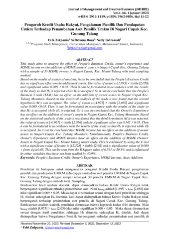 Febi Zulpania, Febi Zulpania and Seflidiana, Roza and Netty, Indrawati (2023) Pengaruh kredit usaha rakyat, pengalaman pemilik dan pendapatan UMKM terhadap penambahan aset pemilik UMKM di Nagari Cupak Kec. Gunung Talang. Journal of Management and Creative Business, 1 (1): 2. pp. 11-22. ISSN 2962-0856