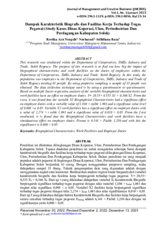 Restika, Ayu Nengsih and Nurhayati, Nurhayati and Seflidiana, Roza (2023) Dampak karakteristik biografis dan fasilitas kerja terhadap tugas pegawai (Study kasus Dinas Koperasi, UKM, Perindustrian dan Perdagangan Kabupaten Solok). Journal of Management and Creative Business, 1 (1): 3. pp. 23-34. ISSN 2962-0856