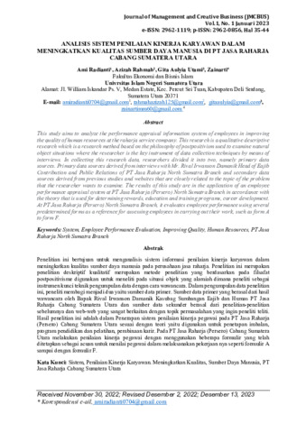 Ami, Radianti and Azizah, Rahmah and Gita, Aulyia Utami and Zainarti, Zainarti (2023) Analisis sistem penilaian kinerja karyawan dalam meningkatkan kualitas sumber daya manusia di PT Jasa Raharja Cabang Sumatera Utara. Journal of Management and Creative Business, 1 (1): 4. pp. 35-44. ISSN 2962-0856