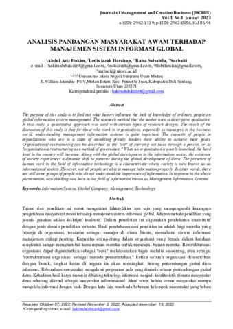 Abdul, Aziz Hakim and Ledis, Izzah Harahap and Raisa, Salsabila and Nurbaiti, Nurbaiti (2023) Analisis pandangan masyarakat awam terhadap manajemen sistem informasi global. Journal of Management and Creative Business, 1 (1): 10. pp. 86-94. ISSN 2962-0856
