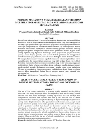 Karmilah, Karmilah (2023) Persepsi mahasiswa vokasi kesehatan terhadap multiplatform digital pada kuliah bahasa Inggris secara daring. Jurnal Teras Kesehatan, 6 (2): 5. pp. 29-37. ISSN 2622-2396