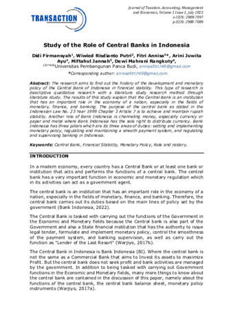 Didi, Firmansyah and Wiwied, Risdianto Putri and Fitri, Annisa and Arini, Juwita Ayu and Miftahul, Jannah and Dewi, Mahrani Rangkuty (2023) Study of the role of central banks in Indonesia. Journal of Taxation, Accounting, Management and Economics, 1 (1): 1. pp. 1-7. ISSN 2988-7089