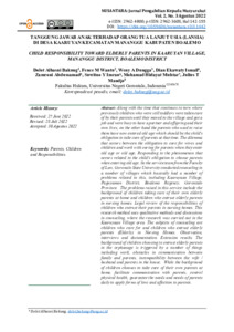 Dolot, Alhasni Bakung and Fence, M Wantu and Weny A, Dungga and Dian, Ekawaty Ismail and Zamroni, Abdussamad and Suwitno Y, Imran and Mohamad, Hidayat Muhtar and Julius T Mandjo, Mandjo (2022) Tanggung jawab anak terhadap orang tua lanjut usia (lansia) di Desa Kaaruyan Kecamatan Mananggu Kabupaten Boalemo. Nusantara: Jurnal Pengabdian kepada Masyarakat, 2 (3): 17. pp. 142-155. ISSN 2962-360X