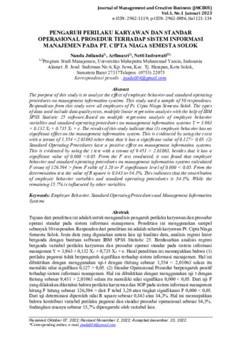 Nanda, Julianda and Arfimasri, Arfimasri and Netti, Indrawati (2023) Pengaruh perilaku karyawan dan standar operasional prosedur terhadap sistem informasi manajemen pada PT Cipta Niaga Semesta Solok. Journal of Management and Creative Business, 1 (1): 14. pp. 121-134. ISSN 2962-0856