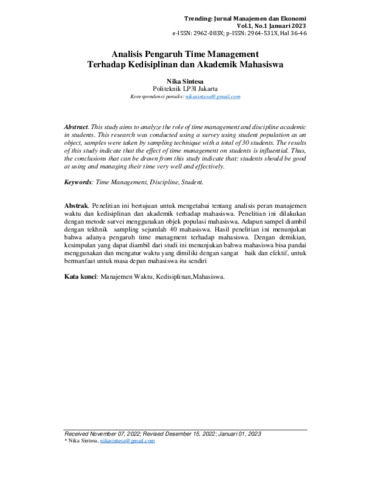 Nika, Sintesa (2023) Analisis pengaruh time management terhadap kedisiplinan dan akademik mahasiswa. Trending: Jurnal Manajemen dan Ekonomi, 1 (1): 5. pp. 36-46. ISSN 2964-531X
