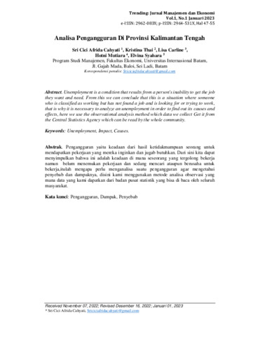 Sri Cici Afrida, Cahyati and Kristina, Thai and Lisa, Carline and Hotni, Mutiara and Elvina, Syahara (2023) Analisa pengangguran di Provinsi Kalimantan Tengah. Trending: Jurnal Manajemen dan Ekonomi, 1 (1): 6. pp. 47-55. ISSN 2964-531X