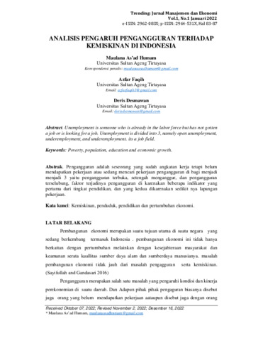Maulana As’ad, Humam and Azfar, Faqih and Deris, Desmawan (2023) Analisis pengaruh pengangguran terhadap kemiskinan di Indonesia. Trending: Jurnal Manajemen dan Ekonomi, 1 (1): 9. pp. 83-87. ISSN 2964-531X