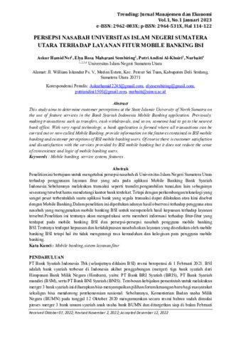 Askur H, Hamid Nst and Elya Rosa Maharani, Sembiring and Putri Andini, Al-Khoiri and Nurbaiti, Nurbaiti (2023) Persepsi nasabah Universitas Islam Negeri Sumatera Utara terhadap layanan fitur mobile banking BSI. Trending: Jurnal Manajemen dan Ekonomi, 1 (1): 12. pp. 114-122. ISSN 2964-531X