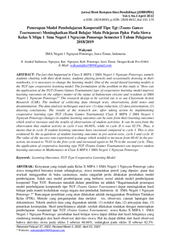 Wahyuni, Wahyuni (2022) Penerapan model pembelajaran kooperatif tipe TGT (Teams Games Tournament) meningkatkan hasil belajar mata pelajaran PPKN pada siswa kelas X MIPA 1 SMA Negeri 1 Ngrayun Ponorogo semester I tahun pelajaran 2018/2019. Jurnal Riset Rumpun Ilmu Pendidikan, 1 (1): 11. pp. 151-175. ISSN 2828-8432
