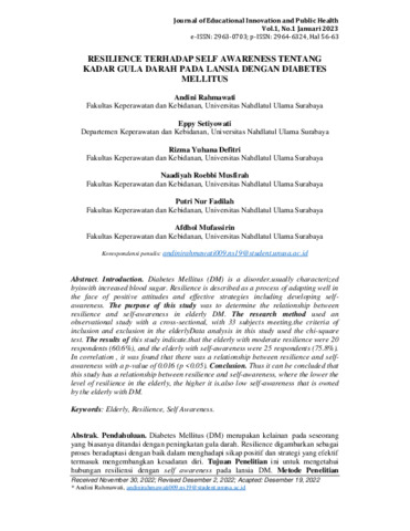 Andini, Rahmawati and Eppy, Setiyowati and Rizma, Yuhana Defitri and Naadiyah, Roebbi Musfirah and Putri, Nur Fadilah and Afdhol, Mufassirin (2023) Resilience terhadap self awareness tentang kadar gula darah pada lansia dengan diabetes mellitus. Journal of Educational Innovation and Public Health, 1 (1): 6. pp. 56-63. ISSN 2964-6324