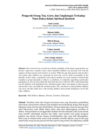 Atun, Lestari and Rahma, Sabila and Difa’ul, Husna and Yuhan, Anendi and Aries, Anang Anshori (2023) Pengaruh orang tua, guru, dan lingkungan terhadap tuna daksa dalam spiritual quotient. Journal of Educational Innovation and Public Health, 1 (1): 7. pp. 64-75. ISSN 2964-6324