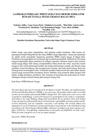 Zuhrina, Aidha and Anna, Tasya Putri and Abdinda, Lorensyifa and Rini, Deby Astria Lubis and Serahayati, br. Hasibuan and Suci, Rahmadani Lingga and Vany, Silvia Sabillah and Syarifah, A’ini (2023) Gambaran perilaku hidup sehat dan bersih indikator rumah tangga di Kelurahan Bagan Deli. Journal of Educational Innovation and Public Health, 1 (1): 8. pp. 76-84. ISSN 2964-6324