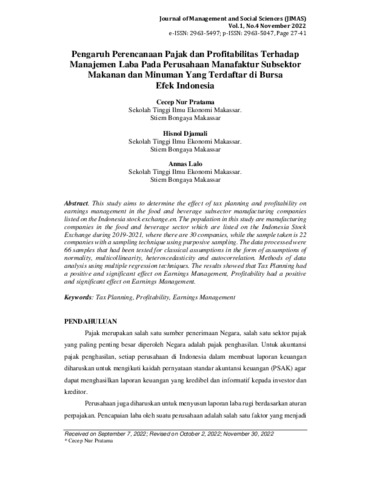 Cecep, Nur Pratama and Hisnol, Djamali and Annas, Lalo (2022) Pengaruh perencanaan pajak dan profitabilitas terhadap manajemen laba pada perusahaan manafaktur subsektor makanan dan minuman yang terdaftar di Bursa Efek Indonesia. Journal of Management and Social Sciences, 1 (4). pp. 27-41. ISSN 2963-5047