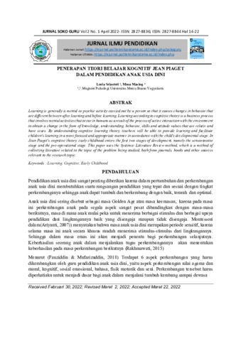 Lucia, Sriastuti and Musa, Masing (2022) Penerapan teori belajar kognitif Jean Piaget dalam pendidikan anak usia dini. Jurnal Ilmu Pendidikan (SOKO GURU), 2 (1): 3. pp. 14-22. ISSN 2827-8836