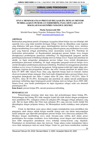 Maria, Surmawanti Diti (2022) Upaya meningkatkan prestasi belajar IPA dengan metode pembelajaran penemuan terbimbing pada siswa kelas IV Sekolah Dasar Inpres Nogodue 2021/2022. Jurnal Ilmu Pendidikan (SOKO GURU), 2 (1): 5. pp. 30-44. ISSN 2827-8836