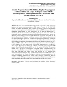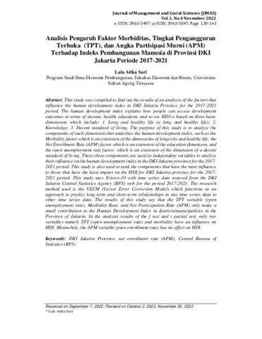 Lala, Atika Sari (2022) Analisis pengaruh faktor Morbiditas, Tingkat Pengangguran Terbuka (TPT), dan Angka Partisipasi Murni (APM) terhadap indeks pembangunan manusia di provinsi DKI Jakarta periode 2017-2021. Journal of Management and Social Sciences, 1 (4). pp. 130-143. ISSN 2963-5047