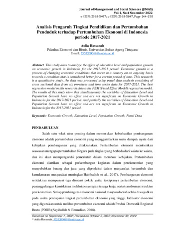 Aulia, Hassanah (2022) Analisis pengaruh tingkat pendidikan dan pertumbuhan penduduk terhadap pertumbuhan ekonomi di Indonesia periode 2017-2021. Journal of Management and Social Sciences, 1 (4). pp. 144-158. ISSN 2963-5047