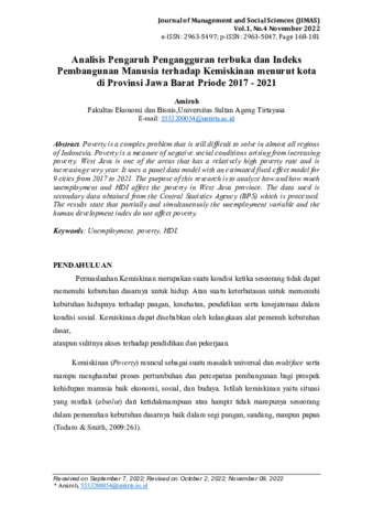 Amiroh, Amiroh (2022) Analisis pengaruh pengangguran terbuka dan indeks Pembangunan manusia terhadap kemiskinan menurut kota di Provinsi Jawa Barat Priode 2017 - 2021. Journal of Management and Social Sciences, 1 (4). pp. 168-181. ISSN 2963-5047