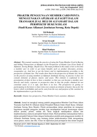 Siti, Rohmah and Irvan, Iswandi and Rizal, Maulana (2022) Praktik penggunaan member card Ponta menggunakan aplikasi Alfagift dalam transaksi jual beli di Alfamart dalam perspektif hukum Islam: studi kasus Alfamart Jembatan Serong, Kota Depok. Jurnal Hukum, Politik dan Ilmu Sosial, 1 (3): 3. pp. 29-42. ISSN 2963-8704