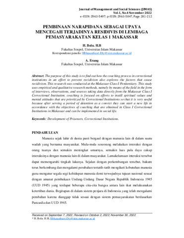 H., Bolu. H.B and A., Erang (2022) Pembinaan narapidana sebagai upaya mencegah terjadinya residivis di lembaga pemasyarakatan kelas 1 Makassar. Journal of Management and Social Sciences, 1 (4). pp. 201-212. ISSN 2963-5047