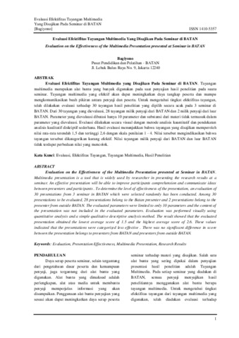 Evaluasi Efektifitas Tayangan Multimedia yang Disajikan Pada Seminar di BATAN. Tayangan multimedia merupakan alat bantu yang banyak digunakan pada saat penyajian hasil penelitian pada suatu seminar. Tayangan multimedia yang efektif akan dapat meningkatkan daya tangkap peserta dan mampu mengkomunikasikan buah pikiran antara penyaji dan peserta. Untuk mengetahui tingkat efektifitas tayangan, telah dilakukan evaluasi terhadap 30 tayangan hasil penelitian yang dipilih secara acak pada 3 seminar di BATAN. Dari 30 tayangan yang dievaluasi, 28 tayangan milik penyaji dari BATAN dan 2 milik penyaji dari luar BATAN. Parameter yang dievaluasi dibatasi hanya 10 parameter dan substansi dari materi tidak termasuk dalam parameter yang dievaluasi. Evaluasi dilakukan secara visual dengan metode analisis kuantitatif dan pendekatan analisis kualitatif diskriptif sederhana. Hasil evaluasi menunjukkan bahwa tayangan yang disajikan memperoleh nilai rata-rata terendah 1,5 dan tertinggi 2,6 dengan skala penilaian 1 - 4. Nilai tersebut mengindikasikan bahwa tayangan tersebut dikategorikan kurang efektif. Nilai tayangan milik penyaji dari BATAN dan luar BATAN tidak terdapat perbedaan nilai yang mencolok.