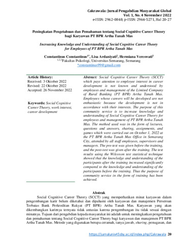 Constantinus, Constantinus and Lisa, Ardaniyati and Hermiana, Vereswati (2022) Peningkatan pengetahuan dan pemahaman tentang social cognitive career theory bagi karyawan PT BPR Artha Tanah Mas. Cakrawala: Jurnal Pengabdian Masyarakat Global, 1 (4): 3. pp. 20-27. ISSN 2964-5271