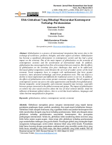 Khoirunisa, Wahida and Hoirul, Uyun and Didit, Kurniawan Wintoko (2023) Efek globalisasi yang dihadapi masyarakat kontemporer terhadap perekonomian. Harmoni, 1 (1). 01-12. ISSN 2986-3457