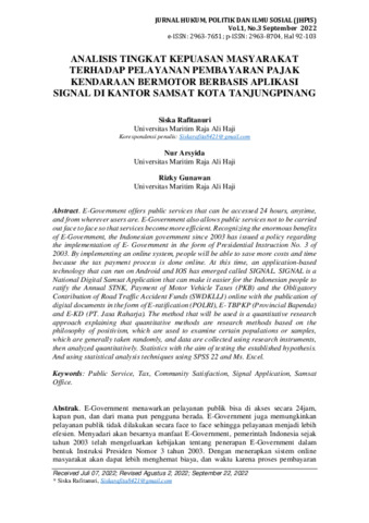 Siska, Rafitanuri and Nur, Arsyida and Rizky, Gunawan (2022) Analisis tingkat kepuasan masyarakat terhadap pelayanan pembayaran pajak kendaraan bermotor berbasis aplikasi Signal di Kantor Samsat Kota Tanjungpinang. Jurnal Hukum, Politik dan Ilmu Sosial, 1 (3): 8. pp. 92-103. ISSN 2963-8704