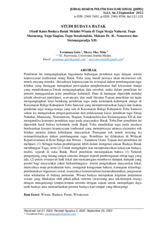 Yerniman, Gulo and Merry Moy, Mita (2022) Studi budaya Batak: studi kasus budaya Batak melalui wisata di Tugu Siraja Nabarat, Tugu Manurung, Tugu Siagian, Tugu Sonakmalela, Makam Dr. IL. Nomensen dan Sisimangaradja XII. Jurnal Hukum, Politik dan Ilmu Sosial, 1 (3): 10. pp. 111-125. ISSN 2963-8704