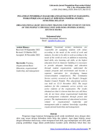 Muhammad, Iqbal (2022) Pelatihan pendidikan dasar organisasi bagi dewan mahasiswa posko perjuangan rakyat Sumatera Selatan. Cakrawala: Jurnal Pengabdian Masyarakat Global, 1 (4): 5. pp. 35-42. ISSN 2964-5271