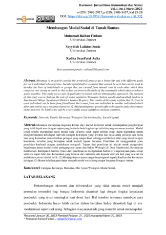 Muhamad, Raihan Firdaus and Sayyidah, Lailatus Sonia and Kadita, Syarifatul Aulia (2022) Membangun modal sosial di tanah rantau. Harmoni, 1 (1). pp. 13-28. ISSN 2986-3457
