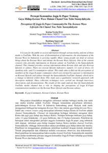 Karina, Novita Dewi and Bambang, Sujarwadi (2023) Persepsi komunitas Jogja K-Poper tentang gaya hidup Korean Wave dalam chanel You Tube Sunnydahyein. Harmoni, 1 (1). pp. 29-45. ISSN 2986-3457